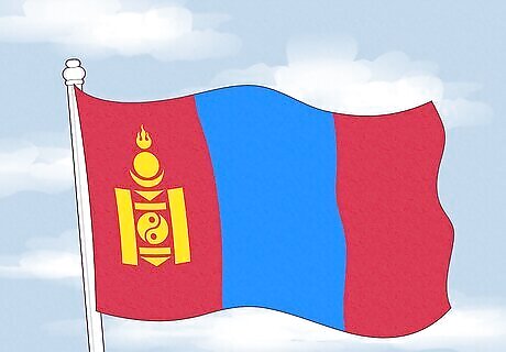 The Mongolian flag has three equal vertical stripes. The outer stripes are both red, while the center stripe is blue. Within the leftmost red stripe, there’s a Soyombo symbol depicted in yellow. The Soyombo symbol is an emblem with deep historical, spiritual, and cultural ties to the Mongolian nation. It’s actually made up of several smaller symbols, including fire, the sun, the moon, triangles (to represent spears), rectangles (to represent fortress walls), fish, and yin-yang.