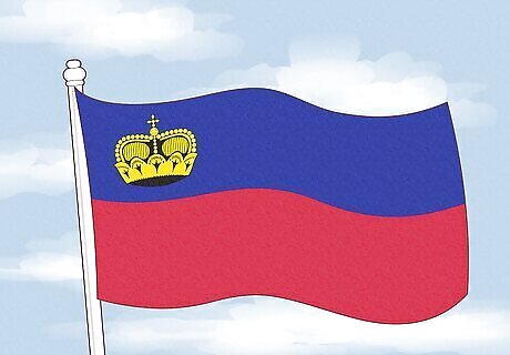 Liechtenstein’s flag is split horizontally into two bands. The top band is dark blue, and the bottom one is red. In the top left corner, there’s a golden crown. The blue and red colors are said to symbolize the sky and the embers in the hearth of every home, respectively. The golden crown, meanwhile, represents the principality’s monarchy and the importance of unity and sovereignty.