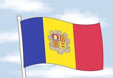 The flag of Andorra, a small country between France and Spain, is a vertical tricolor of blue, yellow, and red. The leftmost stripe is blue, the rightmost one is red, and the middle one is yellow. On the yellow stripe, there’s a depiction of Andorra’s national coat of arms. This coat of arms features a shield with four quadrants, and the phrase Virtus Unita Fortior, or “United virtue is stronger.” The designs inside the quadrants, from top left and moving clockwise, depict the arms of the Bishop of Urgell, the arms of the Count of Foix, the arms of Catalonia, and the arms of the Viscounts of Béarn.