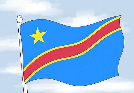 The Democratic Republic of the Congo flies a flag with a light blue field. From the top-right to bottom-left corners of the flag, there’s a red diagonal stripe with a thin yellow border around it. In the top-left corner of the flag, there’s a yellow star. When originally added to the flag in 1877, this yellow star was meant to represent a shining light in the “Dark Continent.” However, it is now believed to symbolize the unity of the Congolese provinces.