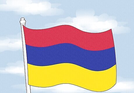 The Armenian flag has three equal, horizontal bands. The top band is red, the middle band is blue, and the bottom band appears yellow, although it’s officially orange. The red is said to represent the country’s struggle for independence. Meanwhile, the blue may represent Armenia’s unchanging landscape, while the yellow (or orange) represents hard work and bravery.