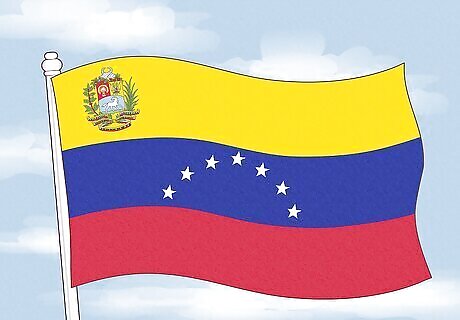 The Venezuelan flag has three equal horizontal stripes in yellow (top), blue (center), and red (bottom). In the center of the flag, there’s a semi-circle of eight white stars, representing the original seven provinces that united against Spain, as well as an eighth star to honor Simón Bolívar and represent the historical province of Guayana. The top-left corner of the flag features the national coat of arms, which includes a sheaf of wheat, a white horse, two cornucopias, a set of tools and weapons, and branches of laurel and palm. Underneath the coat of arms, there are ribbons with the dates of the country’s revolution and Federal War, as well as the words “Independencia” (Independence), “Federación” (Federation), and “República Bolivariana de Venezuela” (Bolivarian Republic of Venezuela).