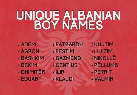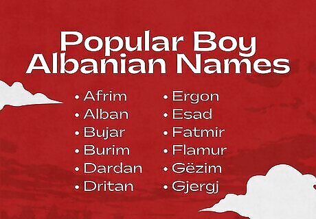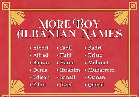 Explore these boy names if you want something that’s not directly Albanian. These boy names don’t have Albanian origin, but they’re still popular choices in the country. Here’s what they mean and where they come from: Albert - Germanic for “noble and bright” or “famous noble.” Aleksandër - Greek for “defender of mankind.” Alfred - Old English for “elf counsel” or “wise counselor.” Ali - Arabic, English, French, and German for “noble,” “sublime,” “high,” “exalted,” “rise,” or “ascend.” Andi - Greek for “manly,” “courageous,” or “brave.” Artur - Celtic for “bear” or “bear-man.” Bajram - Turkish for a Muslim festival, equivalent to the Arabic Eid. Denis - Greek for “devoted to Dionysus.” Edison - English for “son of Edward.” Edmond - Old English for “wealthy protector” or “prosperous guardian.” Elton - English for “Ella’s town” or “old town.” Ervin - German, English, and Hungarian for “army friend,” “wild boar friend,” “sea friend,” or “fresh green water.” Fadil - Arabic for “generous,” “honorable,” or “virtuous.” Halil - Arabic for “friend” or “companion.” Halit - Turkish variant of the Arabic name Khalid, which means “eternal,” “everlasting,” or “immortal.” Hamit - Turkish variant of the Arabic name Hamid, which means “praiseworthy” or “commendable.” Hasan - Arabic for “handsome” or “good looking.” Ibrahim - Semitic for “father of many nations” or “exalted father.” Isa - Arabic for “God is salvation” or “God saves.” Ismail - Arabic for “heard by God.” Ismet - Turkish for “honesty” or “purity.” Jozef - Hebrew for “He will add” or “God will increase.” Kadri - Turkish and Arabic for “pure,” “honorable,” or “valuable.” Kostandin - Latin for “constant,” “steadfast,” or “firm.” Kristo - Greek for “anointed one.” Kristofor - Greek for “Christ-bearer” or “one who carries Christ.” Mehmet - Turkish form of the Arabic name Muhammed, which means “praised one.” Muhamet - Arabic for “praiseworthy” or “the one who is praised.” Muharrem - Arabic for “sacred,” “forbidden,” or “prohibited.” Naim - Arabic and Hebrew for “happiness,” “comfort,” “pleasant,” or “delightful.” Naser - Arabic for “helper,” “supporter,” or “granter of victory.” Osman - Turkish and Arabic for “wise,” “most powerful,” or “baby bustard.” Pal - Latin and Sanskrit for “small,” “little one,” “protector,” and “keeper.” Pandeli - Greek for “all-compassionate” or “all-holy.” Qemal - Arabic for “perfection,” “completeness,” or “maturity.” Ramazan - Arabic for “scorching heat” or “intense heat.” Ramiz - Arabic for “wise,” “noble,” “intelligent,” “dignified,” “honored,” “symbol,” or “distinguished figure.” Robert - Germanic for “bright fame” or “shining with glory.” Roland - Germanic for “famous land.” Sabri - Arabic for “patient,” “enduring,” or “forbearing.” Sami - Arabic for “exalted” or “sublime.” Selim - Arabic for “safe,” “secure,” “peaceful,” or “perfect.” Selman - Arabic for “safe” or “peaceful.” Shaban - Arabic for “to branch out” or “to disperse.” Shefqet - Arabic for “compassion,” “mercy,” or “tenderness.” Spartak - Latin for “from the city of Sparta.” Sulejman - Arabic and Hebrew for “peace.” Thoma - Aramaic for “twin.” Vasil - Greek for "royal" or “kingly.” Vladimir - Slavic for “of great power.”