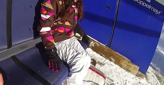 Ride the ski lift up once you’re ready to snowboard. Skate forward to the “Wait here” sign by pushing off the snow with your back foot and sliding forward on the board, like a skateboard. When it’s your turn to get on, skate up to the “Load here” sign. Bend your knees and sit down on the chair once it hits the back of your knees. Then, pull the safety bar down over your lap. While you’re waiting, keep your back foot on the toe-side edge of your board so your feet are next to one another. This makes it easier to get on the lift. Your snowboard will dangle a bit from your lead foot as you ride up. This is fine.