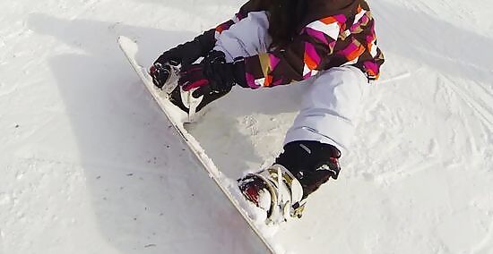 Head downhill. Now that you're strapped in, you're ready to ride. Stand up and don't turn your snowboard so that the lead end of the board is pointing down the hill. Bry recommends learning to slip down the fall line sideways first, otherwise, you'll simply go downhill at full speed. Once you can control the speed and stop on one edge (toe or heel), sit down, roll over, and learn to control the speed and stop on the other edge. To move to the side, shift some of your body weight to one of your feet and use that foot as a pedal to turn more or less downhill. Learn to control your movement direction while keeping most of your weight on that foot. Keep your knees slightly bent and your back straight to maintain balance as you gather speed.