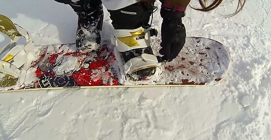 Consider getting a stomp pad. This is a grip pad that goes on your snowboard, just above the binding for your back foot. It gives you a place to put your back foot temporarily, for times when you need to move a little ways but you haven't bound both of your feet to the board yet.