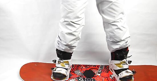 Fit your bindings. Put your lead foot in the front binding. Fasten your bindings tightly and be sure the base of the binding fits your boot snugly, then repeat for your other foot. Move and bounce around a bit to get a feel for the board. If the board seems to be on backward when you look down at it, you may need to have the bindings turned to match your stance. If you're buying a new board, the shop will probably be happy to do this for you for free. If you feel unstable, your bindings may be too close together or too far apart. Check to be sure your feet are roughly shoulder-width apart to ensure a proper stance. Check the angles of the bindings. The angle between both bindings should be 24 to 30 degrees. There are 2 main types of stance: "duck" or "symmetrical" (for example 15 and -15) or "forward" (for example 24 and -6). While mostly a thing of personal preference, angles of your choice should represent how you will be riding. For instance, take a symmetrical stance for park riding, which is a slightly forward stance for higher speeds. Alpine boards need a lot more forward stance.