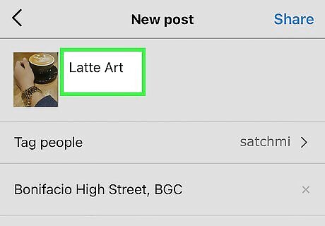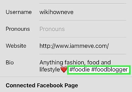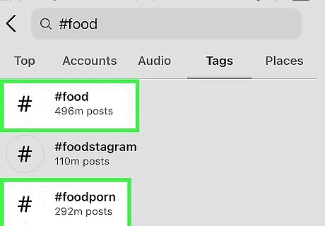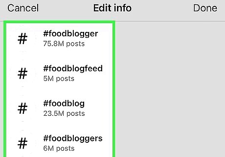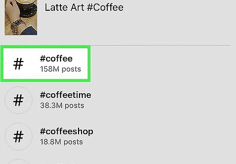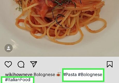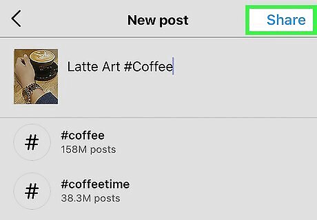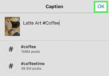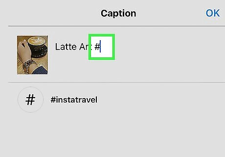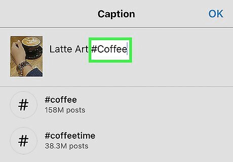 Add hashtags to the post. If you want to add hashtags to the post after creating it, just tap the caption beneath the photo or video, then type the hashtags you want to add. If you have a hashtag in mind, you can add that in the description with "#" preceding it without spaces. For example, a hashtag for cats on Instagram would be "#catsofinstagram".