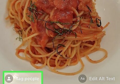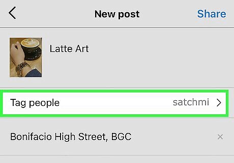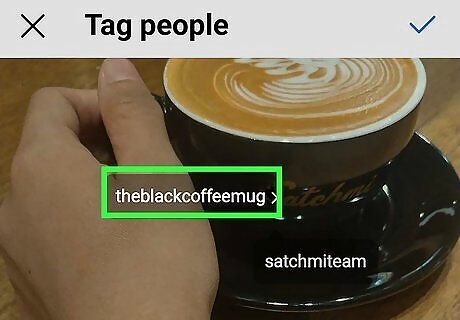Tap Tag people to tag other Instagram users in your post. Even if you already created the post, you can tag people later by selecting this option. Once selected, tap the area of the photo or video you want to tag, then select a user from the list. You can tag multiple Instagram accounts here by tapping additional areas of the image and selecting more users. When you're finished, tap Done or the checkmark to go back.