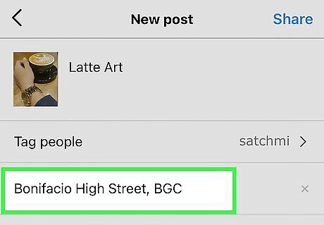 Tap Add location… to add a location tag. If you want Instagram users to know where you took the photo or recorded the video, this option lets you select a location so you can geotag the photo. If you already tagged a location and want to change it, tap that location instead. After selecting a location, tap Done or the checkmark to go back.