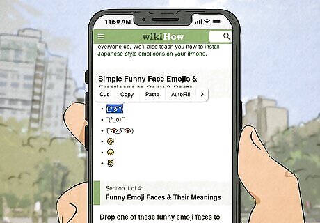 Copy and paste the emoticon directly from your phone’s browser. If you see a funny emoticon you want to copy and paste, press and hold your screen until it highlights the emoticon you want to copy. Tap the copy button, then move to the place you want the emoticon to appear. Press down on your screen until the paste button appears, then select paste. Alternatively, you can download the Japanese Kana keyboard. Launch the Settings app, then tap on “General” and then “Keyboards.” Select “Add New Keyboard…” and scroll down and select “Japanese.” Finally, click on “Kana” to get access to classic kaomojis.