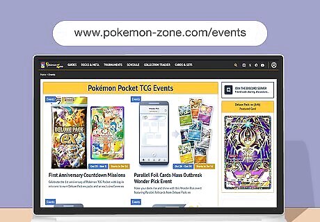 Participate in events on the app. Pokémon TCG Pocket is constantly holding different events that earn you different awards, including free cards. You can also get different tokens in the events, which can help you get free cards, too. Watch out for upcoming events in the app, or check out Pokemon-Zone.com for a complete list of events.