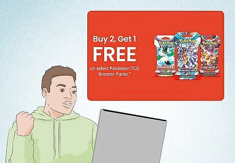 Look for free deals from trading card and gaming companies. Occasionally, stores that sell Pokémon cards might offer deals that allow you to get free packs. However, this often involves buying something else to get the free cards. For instance, GameStop sometimes offers buy two, get one free deals on Pokémon card packs. Some GameStop stores might give you a free pack with a qualifying purchase, like a video game, too. Big box stores, like Target and Walmart, and dollar stores, like Dollar General, may occasionally offer deals or coupons for free cards, too. Don’t forget to check for deals at local gaming and trading card stores in your area! Smaller shops may offer buy one, get one free deals or give you free packs with a purchase, too. During GameStop’s Pro Weeks for Pro Members, they usually offer buy two, get one free deals on Pokémon cards.