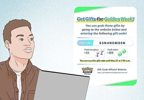 Use gift codes. The Pokémon Company regularly releases gift codes that you enter on the app to get rewards, like free cards and hourglass tokens. Watch out for announcements on the app, or follow social media accounts about Pokémon TCG Pocket to stay up to date. For instance, YouTube channels about the game typically post about gift codes, as well as subreddits like r/PTCGP.