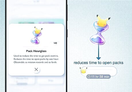 Collect hourglass tokens. Hourglass tokens reduce the amount of time you need to wait to unlock your free booster packs, which allow you to get more each day. Simply earn hourglass tokens by completing missions, doing solo battles, and leveling up your pokémon.