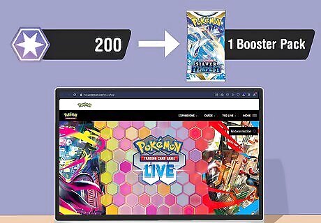 Exchange your in-game points and currency. Playing Pokémon TCG Live earns you points, which you can use to buy packs and cards. For instance, playing matches against players, completing quests, and unlocking Battle Pass tiers give you points. Once you have enough points, go to Shop > Expansions to make your selection. 1 booster pack costs 200 Trainer points.