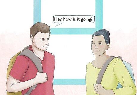 Ask her about her day. A little bit of small talk is a great way to get used to talking to her so you’re not so nervous around her. It also shows that you’re interested in hearing her talk about her problems as well, which is an important part of a relationship. Ask her simple things like, “Hey, how’s it going?” or “How are you doing today?” If she seems upset, you could ask her something like, “Everything okay?” Don’t be too pushy, though. If she doesn’t respond or she replies with a short, one-word answer like, “fine,” then back off.