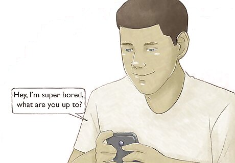 Ask her for her phone number and send her playful texts. If you’ve gotten closer to her, you can ask her for her phone number so you can communicate with her there. Texting is a great way of talking to her casually. You can ask her about her day, or make plans to meet up without the pressure of an in-person conversation. Text her something like, “Hey, I’m super bored, what are you up to?” She may respond saying that she wants to meet up or she may start a text conversation with you. Don’t blow up her phone with a bunch of texts and don’t get angry if she takes a long time to respond to your texts or doesn’t respond at all.