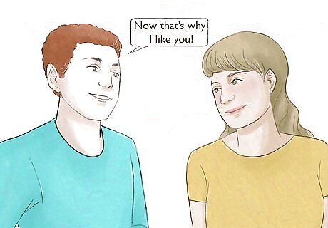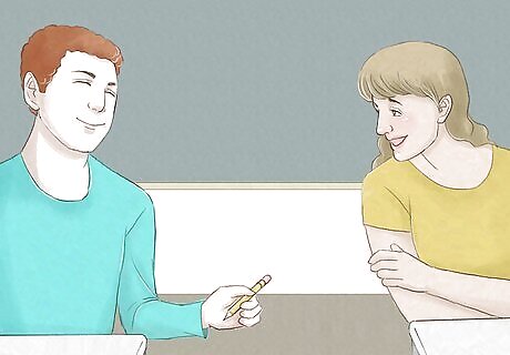 Try making a few jokes with her. Show her that you’re comfortable being around her by breaking the tension with some humor. If you’re in a meeting or a class together, make a joke about something funny that happens or quote a funny line from a movie that you enjoy. Try making silly jokes. Ask her, “What’s brown and sticky?” When she says, “What?” say, “A stick!” Don’t tease her too much or make a joke at her expense or it could push her away. Try not to patronize her by using jokes or quoting movies that you know that she likes. Be genuine and show her your sense of humor.