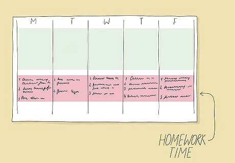 Set aside time for studying and homework every day. Make a habit of focusing on your school work every evening. Designate a block of time for homework, such as a 1-2 hour window. Then, use this time to do your homework. If you have leftover time, study your notes and textbook to help you prepare for upcoming tests. For example, you might study from 3:00 p.m. to 5:00 p.m. or from 7:30 p.m. to 9:30 p.m. Take a 5-10 minute break halfway through your study session.