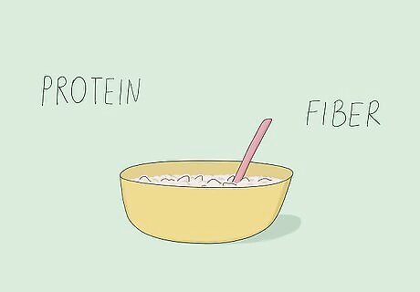 Eat breakfast every morning to help you concentrate during class. Eating before school will help balance your blood sugar so that you're able to focus on your studies. Choose a breakfast that contains protein and fiber to help you feel full longer. However, skip sugary or processed foods that will have you feeling hungry by mid-morning. For instance, eat an English muffin with ham and a slice of cheese. Top a bowl of quick oats with milk, sliced banana, and slivered almonds. Try Greek yogurt with a light sprinkling of granola. Pick a low-sugar, high protein meal replacement bar if you're short on time.