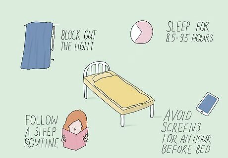 Sleep for 8.5 to 9.5 hours each night so you're well-rested. Your schedule is probably overflowing with things you need to do, so getting enough sleep might seem impossible. However, proper rest will help you retain information better, concentrate, and be in a better mood. Go to bed at the same time each night and wake up at the same time each morning. Additionally, follow a sleep routine to help you get a good night's sleep. Your sleep routine might consist of taking a shower, putting on your pajamas, reading in bed for 30 minutes, and turning out the light. Choose comfortable bedding, block out the light, and avoid screens for an hour before bed to make it easier to fall asleep.