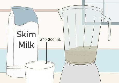 Use milk as the liquid base for your smoothie. Once you’ve picked out your ingredients and loaded them into the blender, pour in 1–1 ⁄4 cups (240–300 mL) of whole or 2% milk. A splash of milk will drive up your protein count even more while also serving as a mixing aid. Skim milk has less than half the calories of whole milk, making it a great addition to any weight loss program. It is a little thinner than full-fat milk, though, so be sure to use slightly less to avoid watering down your smoothie. In addition to plentiful protein, whole milk is an excellent source of vitamins B1, B2, B3, B5, B6, B12, A, C, D, E, and K—it truly does a body good.Tip: If you’re vegan or lactose intolerant, try substituting soy, almond, coconut, cashew, rice, or oat milk.
