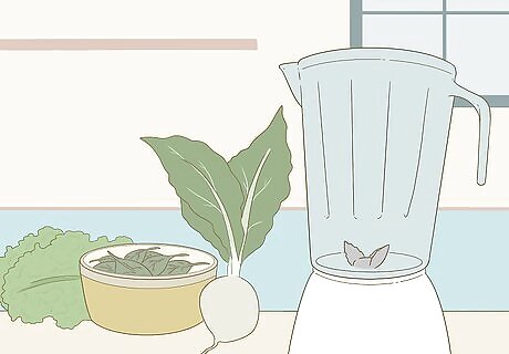 Add a handful of leafy greens. Greens are another mix-in that blend and mesh well with a wide variety of other ingredients, especially in green smoothie recipes calling for carefully-chosen complementary flavors. While they’re ordinarily touted for their vitamin and mineral content, a single cup (roughly 30 g) of spinach, turnip greens, kale, or spirulina contains about as much protein as an egg. Don’t forget to rinse and dry raw greens thoroughly before adding them to your smoothie. If you’re not a fan of earthier smoothies, combine a serving of greens with ingredients that lend bold sweet or tart notes, like bananas, mangoes, dates, grapes, cacao nibs, honey, and citrus.