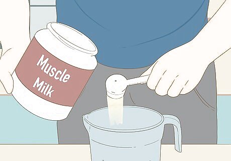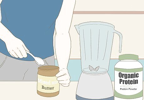 Use a high-quality whey supplement to easily up your protein intake. Whey is one of the 2 main types of protein found in milk, the other being casein. Simply measure out 1-2 full servings of your protein powder of choice using the included scoop, then dump them in with the rest of your ingredients and blend until smooth. For maximum nutritional benefit, shop around for a supplement that isn’t chock-full of added sugars, maltodextrin, or other filler components. Protein concentrations vary widely between supplements, but a single scoop of whey often contains somewhere between 20 and 40 grams. Check the nutrition facts on the label of the product you're using for more exact guidelines. Since whey protein is absorbed quickly by the body, it’s ideal for refueling tired muscles as part of a post-workout shake. Powdered whey supplements tend to impart a pretty distinct aftertaste. If you’re looking for something less intrusive, try a more palatable mix-in like nut butter or yogurt instead.Tip: Keeping a good whey supplement on deck is one of the easiest ways to meet your daily protein quota. Most nutritionists recommend that the average adult get at least 1 gram (0.035 oz) of protein for every 3 pounds (1.4 kg) of bodyweight.
