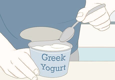 Spoon in some plain Greek yogurt. Add 1 cup (245 g) of full-fat yogurt along with your milk, juice, or whatever liquid you’ll be using for blending. The rich yogurt will help thicken up your smoothie, giving it a delectable, ultra-creamy finish. Greek yogurt typically contains more protein per serving than other yogurt recipes. Another option you might try out if it’s available to you is kefir, which is like a liquid version of yogurt that’s packed with protein, vitamins, and beneficial probiotics for better gut health. Unflavored yogurt can be a bit bitter, so you may want to use a small amount of honey or another natural sweetener as a counterbalance if you’re not a big fan of the flavor.
