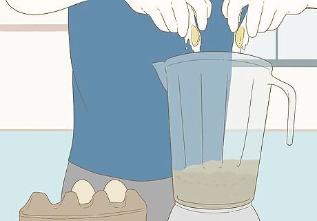 Crack 1-2 raw eggs right into the blender. It turns out that Rocky was onto something, though blending eggs into a smoothie will be much more agreeable for most people than gulping them down on their own. A single average-sized egg contains a whopping 6-7 grams of protein, while especially large eggs may hold as much as 12-13 g. To maximize your protein intake, be sure to use the whole egg, not just the white. This can be a great way to put that last lonesome egg that’s been sitting in your refrigerator to good use. Make sure your eggs come from a healthy source so you know that they’ll be safe to eat raw. You can also get the kind that are pasteurized in-shell if you’re worried about foodborne illnesses.