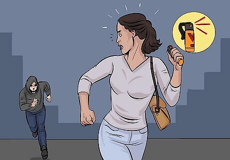 Arm yourself for an attack. If screaming and running don't deter the criminal, then continue moving in the direction of safety, and while you do, pull out any potential weapons you have on you. If you carry pepper spray, now's the time to pull it out of your bag and have it at the ready. Other potential weapons include pocket knives, keys, or heavy objects like textbooks. Keep your weapon in your hand as you continue moving toward safety. Sometimes merely showing the criminal that you are armed is enough to prevent an attack. For example, if you do have pepper spray, pull it out and point it toward the criminal, saying "Don't come any closer. I have pepper spray," out loud.