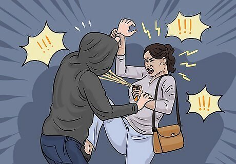 Fight back. If the criminal grabs you and begins to assault you, use whatever weapons you have to physically harm the other person. Poke them in the eyes, kick them in the genitals, scratch them with your nails, spray them with pepper spray, etc. If you have a heavy object like a textbook, try to knock the person unconscious by hitting them on the side of the head. Continue screaming and drawing attention to yourself as you fight back against your attacker. The longer and louder you scream, the more likely it is that somebody will hear you and come to your rescue.