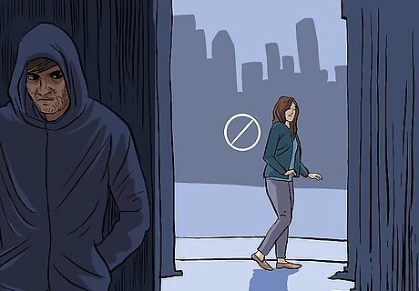 Stay in well-lit, densely populated parts of town. Criminals tend to lurk in dark, deserted streets where there is less law enforcement and fewer potential witnesses. If you are walking down the sidewalk at night, stay as close to the street as possible as criminals may be waiting in alleys for a chance to attack passersby.