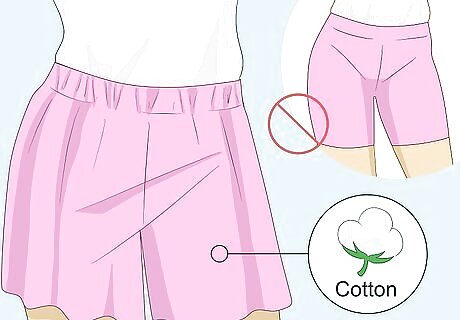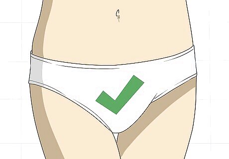 Wear loose, cotton underwear. The bacteria that causes UTIs thrives in a warm, moist environment. If you wear cotton undergarments then they help to wick away moisture and allow for air flow. Similarly, wearing loose fitting pants can keep your genital region dry and clean. It’s also important to take off any wet clothing, such as workout pants or bathing suits, as soon as possible. Check the label in your underwear to make sure it's not made of nylon or synthetic material, which you should avoid. Don't wear thongs, which increase your risk of infection by irritating your vaginal tissues.