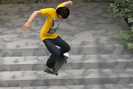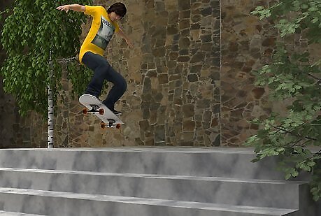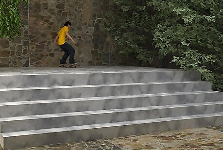 Know how to bail when getting a feel for the trick. Roll up to the stairs ready to attempt whatever trick you want. If you just bail out and kick the board away, then be ready to squat and roll. If the concrete at the landing is smooth, like a skatepark, then you can slide out but be sure that you roll over onto your side or back, because that's more comfortable. The squat and roll is what saves you from injuries resulting in shock, and from cuts or bruises. The squat absorbs shock into your legs rather than just your feet, and when you roll you should roll onto your side or do some kind of flip over your shoulder, but make sure you're not going to hurt yourself. Practice the roll on flat ground or in the grass.