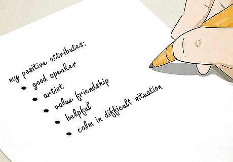 Write down your positive attributes. Write the 3 things about your looks and the 3 things about your personality that you like the most. Place all 6 items in order of importance and write 1 sentence about each. For example, “I help others. I volunteer every week for a local charity and always call my friends back right away when they need to talk.”