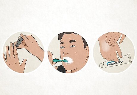 Stay well-groomed. Looking like you thought about your appearance and are taking care of yourself can boost your confidence and can be achieved with a few simple grooming tips: Keep your nails trimmed and shaped neatly (women and men can benefit from this tip). Be sure your nail beds are clean. Brush your teeth several times daily, particularly after meals with tooth-gunk potential. Keep moist wipes and cleansing cloths with you to clean off makeup, sunscreen, and sweat, or just to refresh yourself after a few stressful hours. Make sure to also do a full facial wash every 2 to 3 days to keep your skin clear. Use an anti-aging moisturizer, sun protector, and concealer (to even out skin tone). Use your fingers (as opposed to brushes) to apply makeup and get a better feel (literally) for how much makeup you are applying that can lead to a more natural look. Use press-on nails for a quick manicured look. Even for people who experienced the 80’s, they are more socially acceptable today than you might realize! Apply a deodorant or antiperspirant regularly. Use natural oils (eg, avocado, coconut, or almond) to keep your body and hair moisturized.