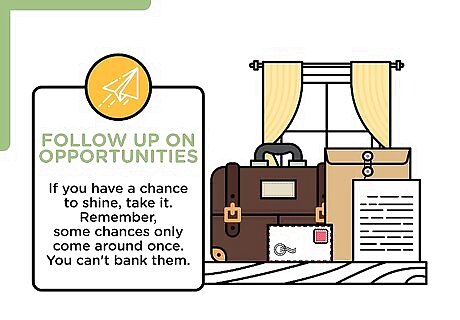 Follow up on opportunities. If you have a chance to shine, take it. If you are worried you won't have time and energy for a good opportunity, ask yourself: would this contribute to my end goals? If it would, then get rid of other commitments in order to pursue this opportunity. Remember, some chances only come around once. You can't bank them. This doesn't mean you should throw away all your savings or get rid of your safety net. It just means you should say yes when you are given an offer to move ahead.