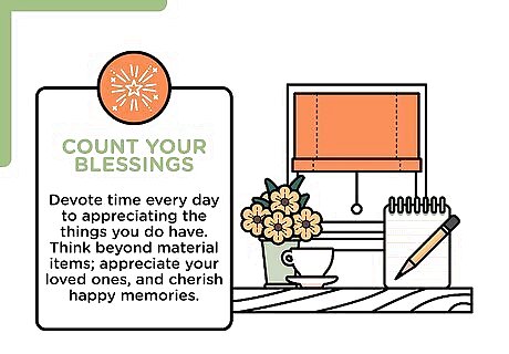 Count your blessings. No matter how much you achieve in life, you will always feel unhappy if you constantly focus on what you don't have. Instead, devote time every day to appreciating the things you do have. Think beyond material items; appreciate your loved ones, and cherish happy memories. This is also important when thinking about the future. Instead of fearing what might happen, try to be excited for the new experiences you will have.