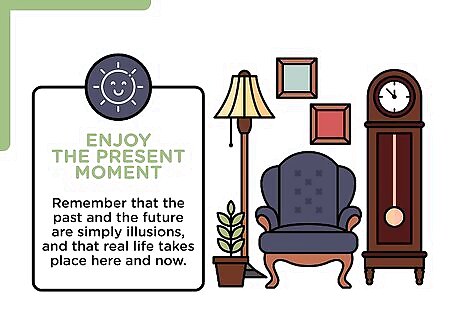 Enjoy the present moment. If you are constantly dwelling on the past or daydreaming about the future, you are missing out on the present moment. Remember that the past and the future are simply illusions, and that real life takes place here and now. Start paying attention to negative thoughts so that you can move on from them and enjoy the present moment. If a negative thought arises in your head, then acknowledge it, label it a negative thought, and then let it fade away. Regular meditation or mindfulness exercises can help to make this feel more natural for you. Get in the habit of paying attention to small details around you. Appreciate the feeling of the sun on your skin, the sensation of your feet walking on the ground, or the artwork in the restaurant you are eating in. Noticing things like these will help you silence a rambling mind and appreciate every moment.