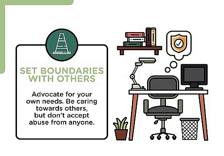 Set boundaries with others. Advocate for your own needs. Be caring towards others, but don't accept abuse from anyone. Remember, being a good person does not mean you have to take violent or disrespectful language or actions from anyone. Respect the boundaries others set for you, too. Listen to your loved ones when they tell you they need space, or want to do something alone.