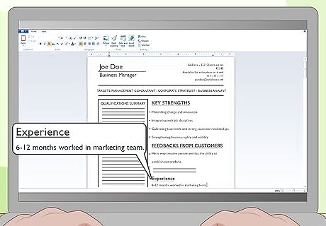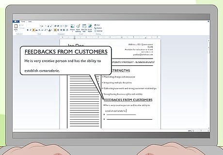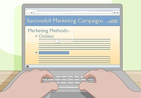 Create work samples to put a portfolio together. To highlight your skills, put a work portfolio together based on your specific area of study or expertise. If you’re in business, put together some business plans that emphasize viral marketing and consumer retention. If you’re in copywriting, create a few sample campaigns to highlight your skills as a creative writer. Put 3-4 strong work samples together to share with potential clients and employers. Professional portfolios are often a graduation requirement for college degrees in marketing, communications, advertising, or graphic design. If your focus is in graphic design or coding, consider creating a few sample websites to showcase your work. What belongs in your portfolio is entirely dependent on your area of expertise.