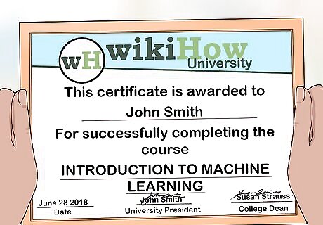 Earn a relevant certification or degree to help you land a job. In engineering, many people get high-quality jobs without a formal education. However, accreditations will make you a more valuable job candidate and, in some cases, will be the only way to fulfill a company’s job requirements. To boost your chances of landing a machine learning position, work toward things like: Online Nanodegrees in computer science, engineering, and machine learning. A Certificate in Machine Learning from the University of Washington. An Artificial Intelligence Graduate Certificate from Stanford. A Certification of Professional Achievement in Data Science from Columbia University. A CSCI E-81 Machine Learning and Data Mining certification from Harvard. A traditional undergraduate or graduate degree in computer science or engineering.