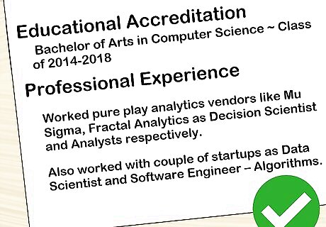 Write a resume that highlights your machine learning skills. When creating a resume for a machine learning position, focus on things relevant to the field such as your professional experience and educational accreditations. For any previous jobs, make sure to list specific things you accomplished related to machine learning. If you completed any job-relevant personal projects, feel free to list them on your resume using short, sentence-long descriptions. If possible, include a link to the project so the company can see it.