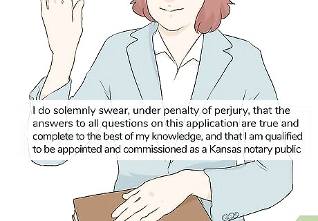 Recite the oath of office with another notary public to complete section B. Contact another notary in your area and let them know that you need to complete the oath for your application. Meet with the notary and give them a driver’s license or passport so they can verify your identity. Raise your right hand in the air or place it on a Bible while you recite the oath listed on the application while you’re in front of the notary. When you’re finished, the notary will sign and stamp your application. The oath for Kansas notaries is, “I do solemnly swear, under penalty of perjury, that the answers to all questions on this application are true and complete to the best of my knowledge, and that I am qualified to be appointed and commissioned as a Kansas notary public.” You can also use the phrase, “sincerely and truly declare and affirm,” instead of saying “solemnly swear” if you want. Do not fill out section B on your own since you won’t be accepted as a notary.
