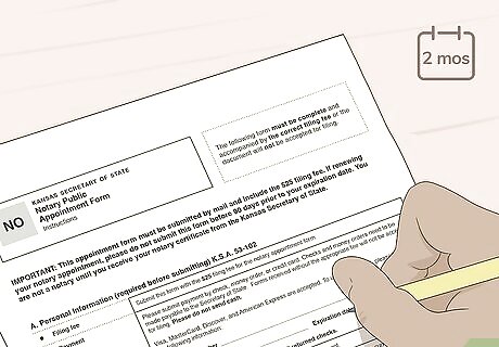 Fill out a new application 2 months before your appointment expires. You’re certified for 4 years after the Secretary of State files your application, and the expiration date will be listed on your certificate. If you want to continue being notary, download the same application form you used to apply. Select the “Reappointment” box in Section A and write down the expiration date of your current certificate. Fill out the form completely, and be sure to have another notary present to fill in section B. Mail the application and a $25 USD check to the Secretary of State office. You can download the form here: https://www.kssos.org/forms/administration/NO.pdf. Address the envelope to: Memorial Hall, 1st Floor120 S.W. 10th AvenueTopeka, KS, 66612-1594