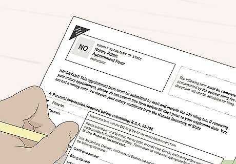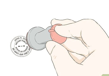 Obtain a surety bond for $7,500 USD from an insurance or bond company. A surety bond provides compensation to someone if you fail your notarization duties and is required for all notaries in Kansas. Visit an insurance company or a bond agency and talk to them about getting a surety for at least $7,500 USD. Fill out the paperwork and pay any fees required for your surety bond so you can get approved. You can also apply for an errors and omissions (E&O) insurance policy to protect you from claims or suits due to any errors you make, but it is not required by the state of Kansas.