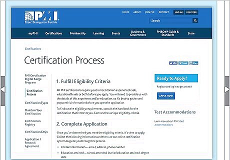 Work on the CAPM certification if you’re new to project management. If you have never worked as a project manager before, The Certified Associate in Project Management (CAPM) certificate is the way to go. Like the PMP, this certification is recognized internationally. You only need a high-school diploma to qualify, and—as with the PMP certification—will need to pass an exam to receive the certificate. You can take the exam either online or at a testing center. The CAPM is also offered through the PMI. Begin your application online at: https://www.pmi.org/account-registration.