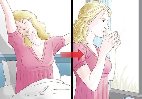 Get up and get moving. Your day can’t really begin until you manage to get out of bed. It is typically best to get out of bed as soon as possible after waking up, and set up roadblocks against the urge to climb back under the covers. Actually rising from bed properly, by stretching your spine, then each arm and leg, all while breathing slowly and deeply before sitting then standing, can get you off to a good start. Simple steps like locating your alarm clock so that you have to walk across the room to shut it off, splashing water on your face, or making the bed can help get and keep you up and moving. Again, you can consult How to Be a Morning Person for more details. Leaving the room to drink a glass of water can prove doubly effective, as it gets you away from the bed and helps counteract nighttime dehydration, which can cause a lethargic body and mind.